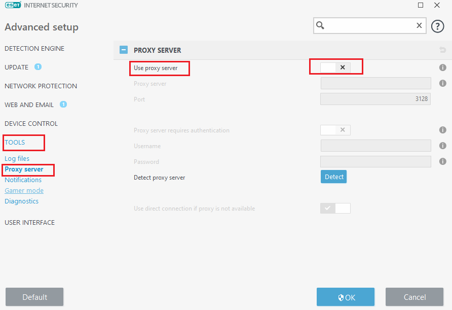 وارد مسیر Advanced setup دکمه میانبر آن F5 می باشد و سپس وارد بخش Tools و پس از آن وارد بخش Proxy Server شوید