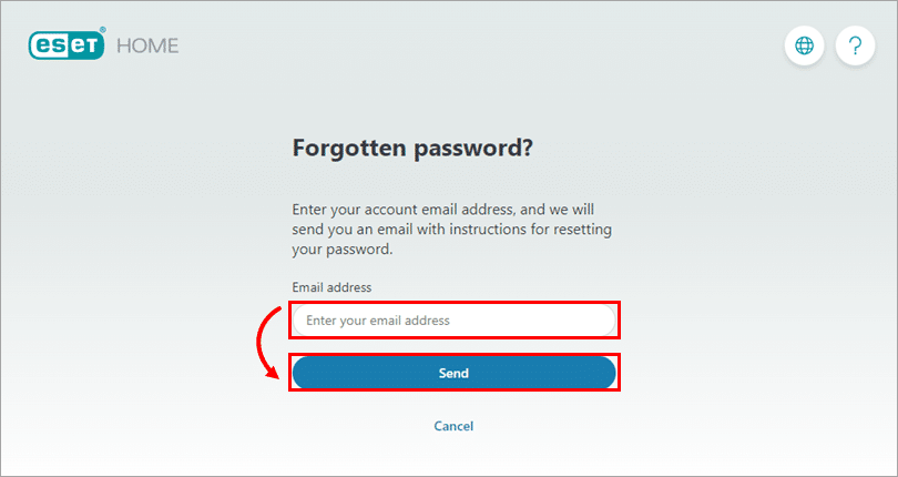 در فیلد ایمیل آدرس ایمیلی را که برای ثبت نام در ESET HOME استفاده کردید تایپ کنید و روی ارسال کلیک کنید.