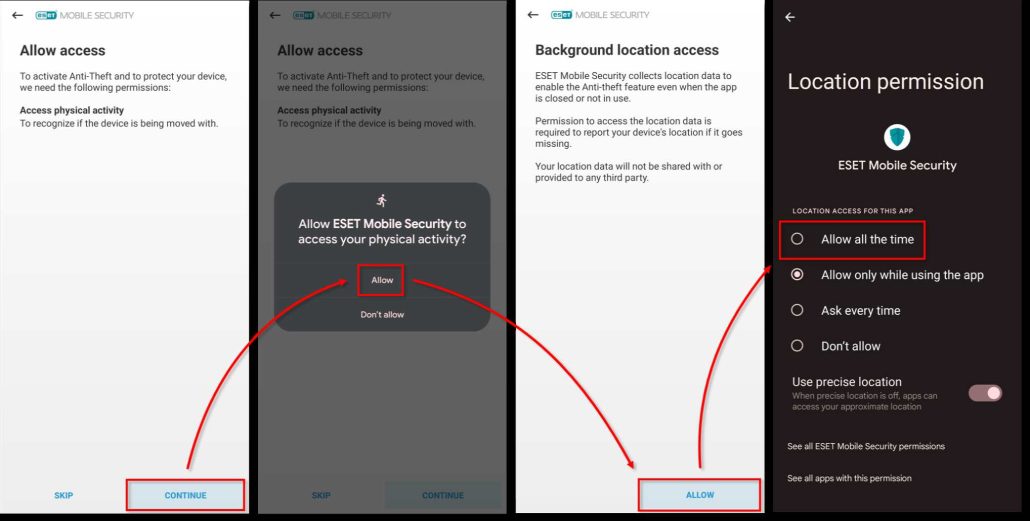 روی فعال کردن → اجازه دادن ضربه بزنید و در صفحه مجوز دسترسی: دسترسی به کاربرد، روی ادامه ضربه بزنید . روی ESET Mobile Security ضربه بزنید و برای فعال کردن آن، روی ضامن کنار مجوز دسترسی به کاربرد ضربه بزنید .