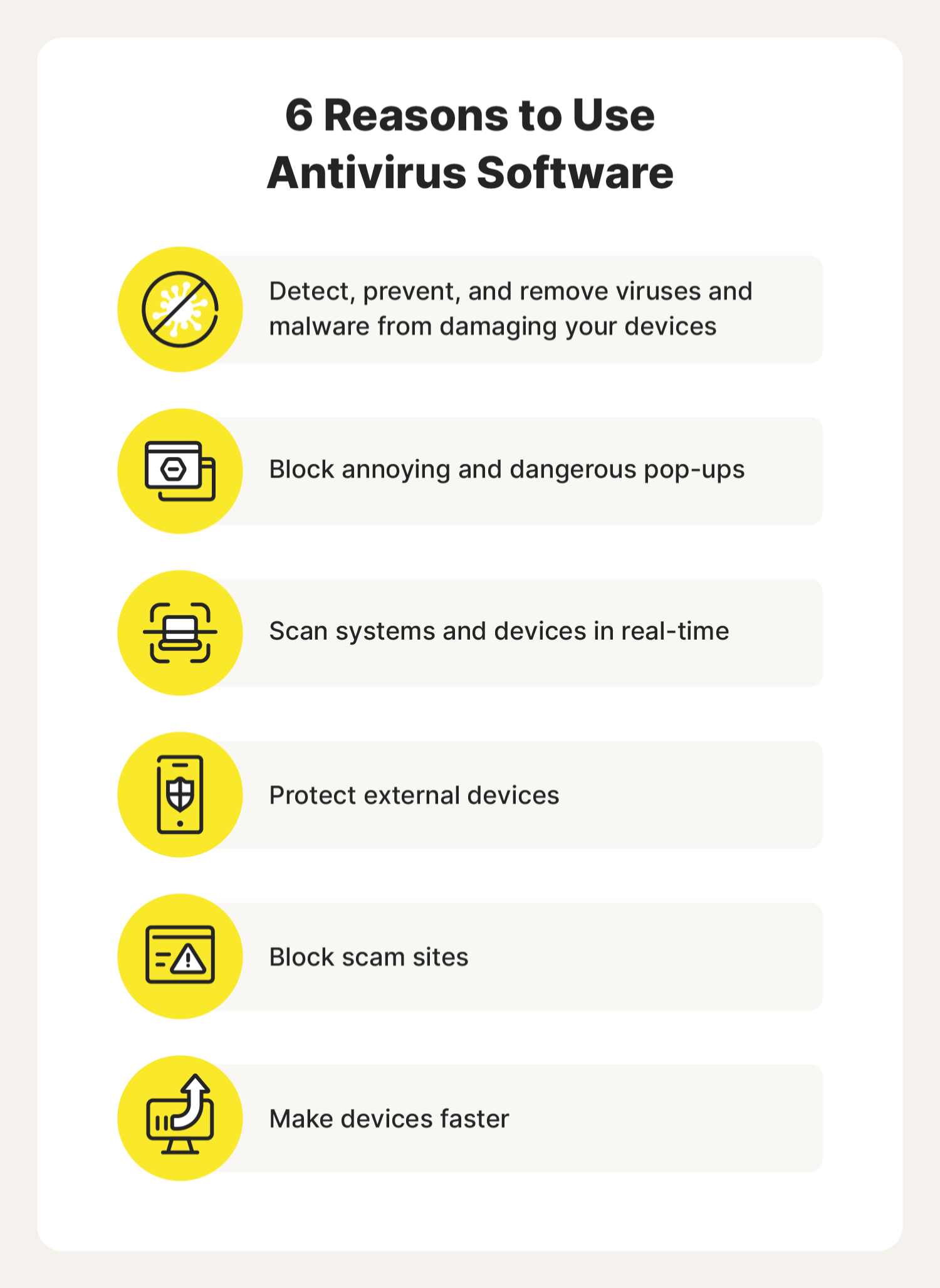 نرمافزار آنتیویروس برای محافظت از سیستم ها و دستگاههای تلفن همراه در برابر بدافزارها، هکرها و مجرمان سایبری طراحی شده است. با بررسی دادههای موجود در هارد دیسک و دادههای ورودی از اینترنت، از جمله وبسایتها، پیامها و پیوستهای ایمیل و برنامهها، نرمافزار آنتیویروس میتواند نرمافزارهای مخرب، لینکهای آلوده و سایر تهدیدات و فعالیتهای مشکوک را شناسایی، مسدود و محافظت کند.
