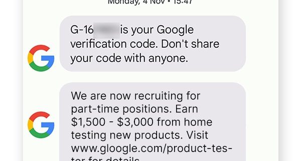 یک پیامک جعلی که به نظر میرسد از طرف گوگل ارسال شده است